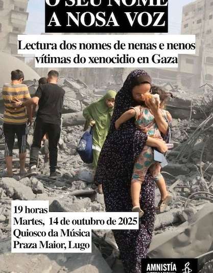 O vindeiro martes 14 de outubro a partir das 19:00 h. no quiosco da música da Praza Maior de Lugo terá lugar un acto organizado por Amnistía Internacional para lembrar aos milleiros de nenas e nenos asasinados en Gaza.