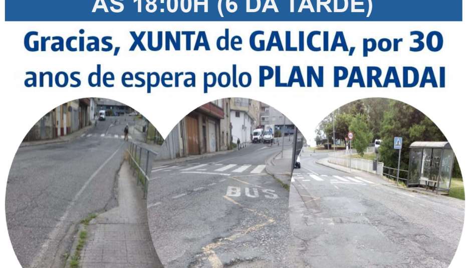 A Federación de Asociación Vecinais da Provincia de Lugo “Lucus Augusti” convoca para o próximo día 20 de febreiro ás 18:00 horas unha concentración de Veciños no fondo da Calzada de las Gándaras confluencia con Serra de Meira, para reclamar o final das obras do Plan Paradai, concretamente as obras que faltan son Serra de Meira e Calzada das Gándaras.